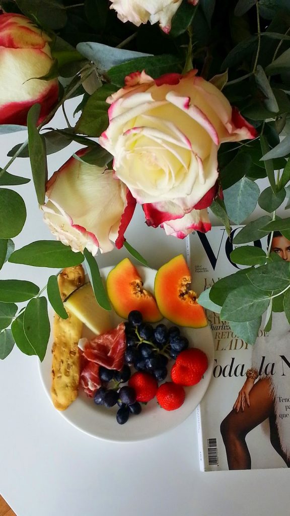 Nada como empezar el día con este súper desayuno que me he preparado hoy, algo de fruta y de proteína…las flores son del bautizo (elegí esta combinación de rosas y eucalipto que me pareció ideal!).