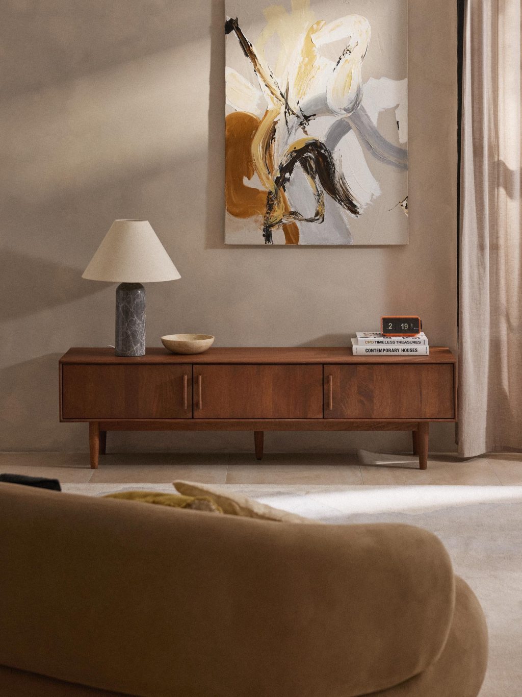 Salones, comedores o recibidores que buscan un toque retro con diseño depurado y materiales cálidos.