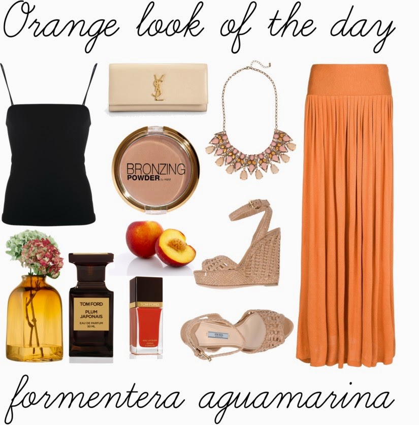 Giorgio Armani low cut shirt, €205 / Mango maxi skirt, €52 / Prada high heel platform sandals, €525 / Yves Saint Laurent , €750 / BaubleBar chandelier jewelry, €27 / H&M , €3,42 / Tom Ford perfume, €160 / Tom Ford , €24 / LSA International Umberto Vase – Amber (32cm), €69