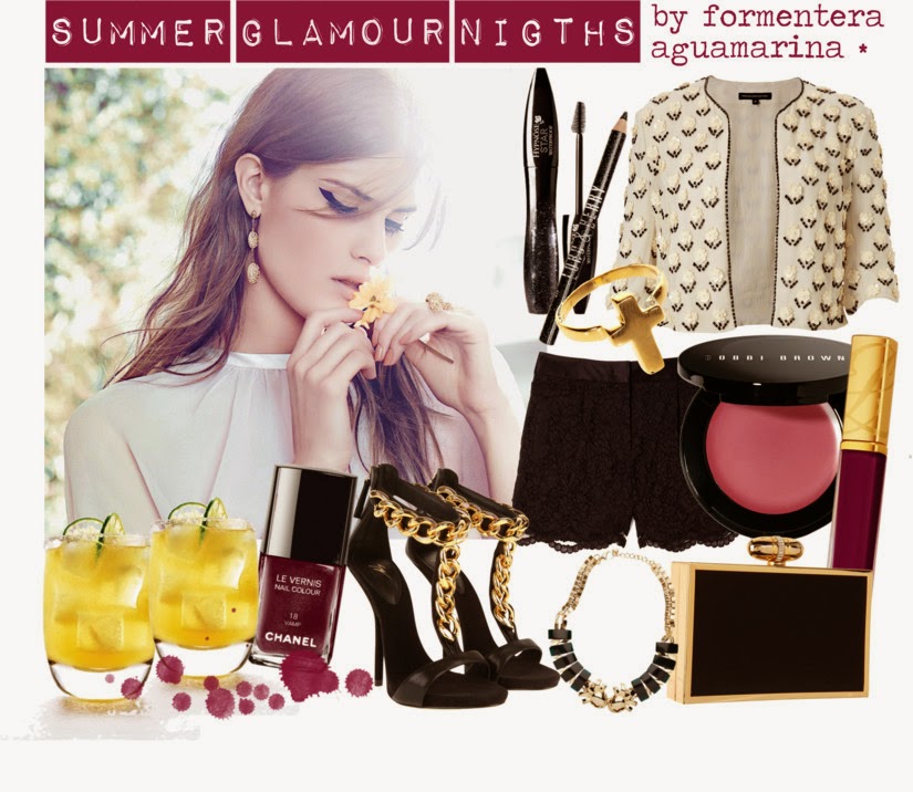 DKNY shorts, €235 / French Connection , €120 / Giuseppe Zanotti high heels / Franchi , €175 / Mimco , €92 / Zara Simon yellow gold jewelry / Bobbi Brown Cosmetics pink blush, €19 / Estée Lauder lip makeup, €18 / Lancôme waterproof mascara, €26 / Lord & Berry pencil eyeliner, €9,48