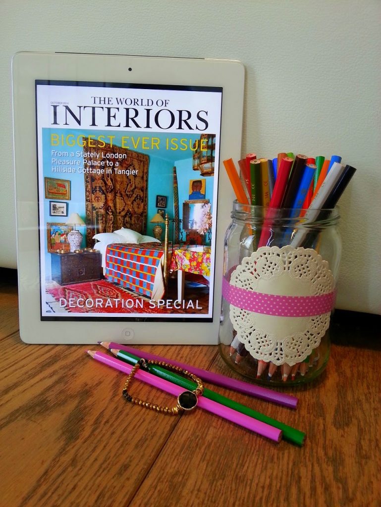 También quería enseñaros una de mis revistas fetiche de interiorismo: THE WORLD OF INTERIORS (el lapicero lo hice yo a mano para la decoración de nuestra boda y la pulsera es de Isabel Guarch).