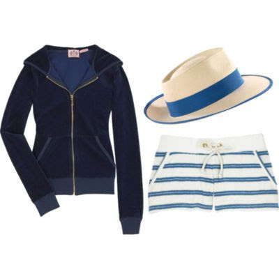 Juicy Couture Logo track top, Juicy Couture Striped Lurex shorts, Hermes straw hat with blue ribbon