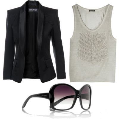 Balmain jewellled silk tank, Prada Butterfly frame sunglasses, Balmain blazer smoke